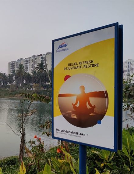 Before restoration, the Margondanahalli Lake’s was in a dire state. It was filled with sewage and sludge. Wild and frenzied growth of hyacinths caused foul odour, rendering it inaccessible to local residents and community. The lake’s condition was further worsened by the dumping of city waste and other debris. Over time, it was heavily encroached upon with a proliferation of weeds, leading to the death of marine life due to eutrophication. As part of the Margondanahalli Lake’s restoration, JSW Foundation and Malligavad Foundation were able to rejuvenate the Lake as a natural recreational zone for the local residents. The highlights of the restoration are as follows: